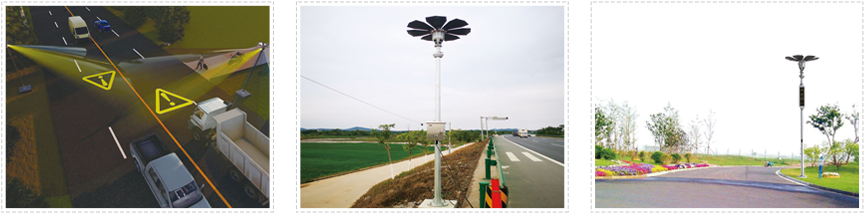 基于短距监测雷达、360°无死角相机、高度投影光学设备、太阳能蓄电池等模组,实现在偏僻路段及盲区死角多的T字路口,通过光斑投影、警灯爆闪、语音播报等多种方式提醒过往行人、机动车减速慢行,在减少交通管理运营成本同时,为出行者提供更好的安全服务。