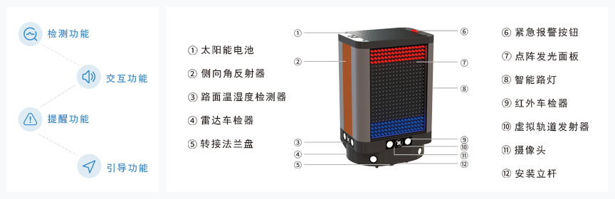 一款基于当下智慧交通面向未来车路协同发展方向的路侧终端设备。采用视频雷达激光等先进技术、具备多种道路信息的感知传输与交互功能、符合绿色节能轻载物联的先进理念、可根据实际需求灵活配置增减功能、配备专用安装套件路侧安装仅需十几分钟。